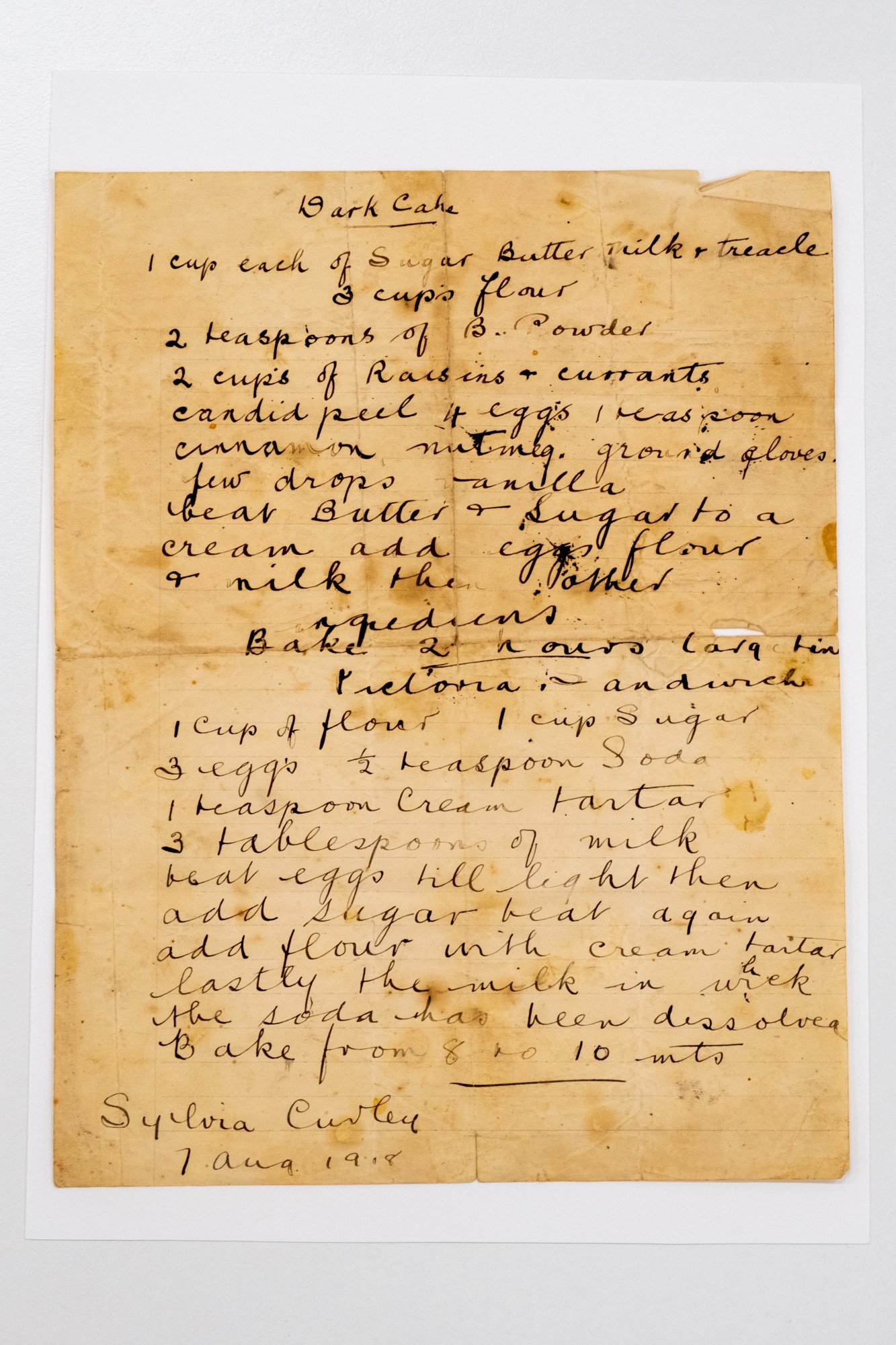 Silvia Curley's handwritten dark cake recipe, 1918, Mugga-Mugga Collection